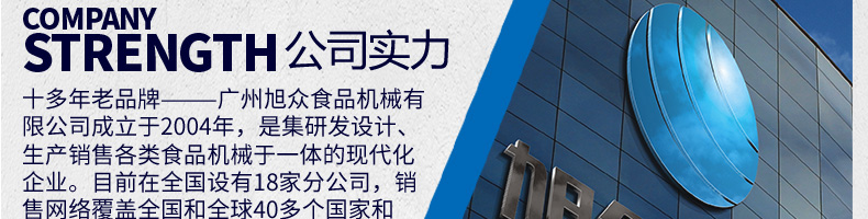 廣州旭眾食品機械有限公司是一家集科研開發,生產設計,營銷服務為一體的現代化生產企業。現代化生產車間,精湛制造技術,所產機械歷經市場重重考驗,不斷贏得海內外客戶的贊譽。