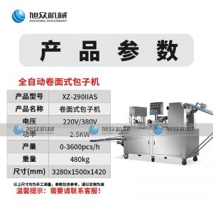 名稱290IIAS卷面式包子機 電源220/380V 功率2.5kw 產量0-3600個/h 尺寸3280×1500×1420mm 重量480KG 規格 其他