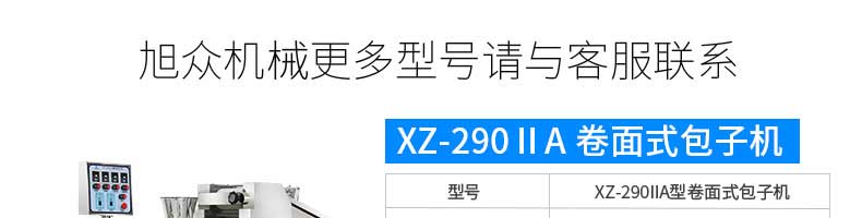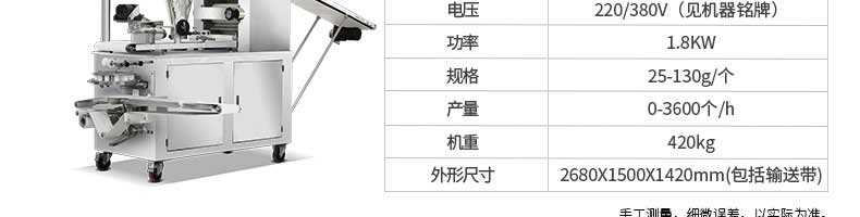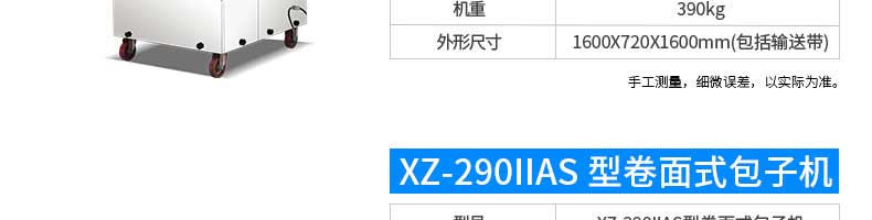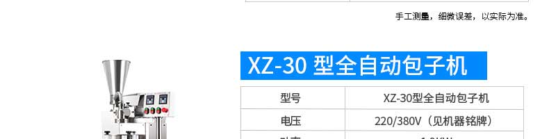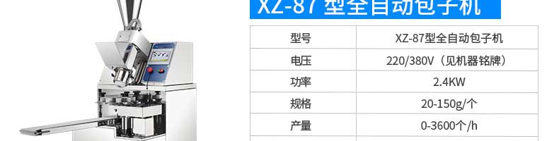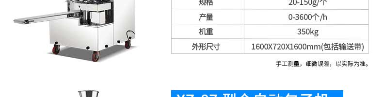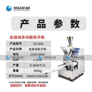 名稱XZ-85A全自動包子機 電源220/380v 功率2.4kw 產量 尺寸1600*720*1600mm 重量390kg 規格20-150克/只 其他