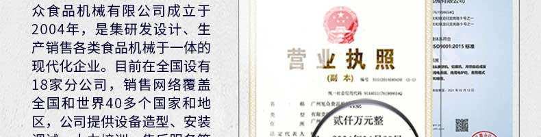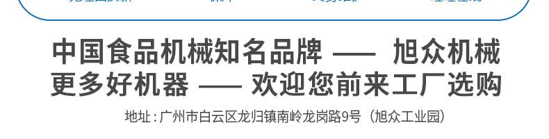 廣州旭眾食品機(jī)械有限公司是一家集科研開發(fā),生產(chǎn)設(shè)計,營銷服務(wù)為一體的現(xiàn)代化生產(chǎn)企業(yè)。現(xiàn)代化生產(chǎn)車間,精湛制造技術(shù),所產(chǎn)機(jī)械歷經(jīng)市場重重考驗,不斷贏得海內(nèi)外客戶的贊譽(yù)。