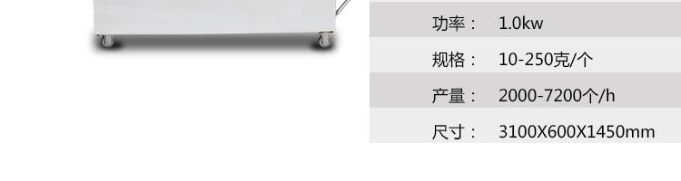 名稱MP800型刀切饅頭成型機 電源220/380V(見機器名牌) 功率1.0kw 產量2000-7200個/小時 尺寸3700*600*1380mm 重量380kg 規格10-250克/個 其他單段壓面