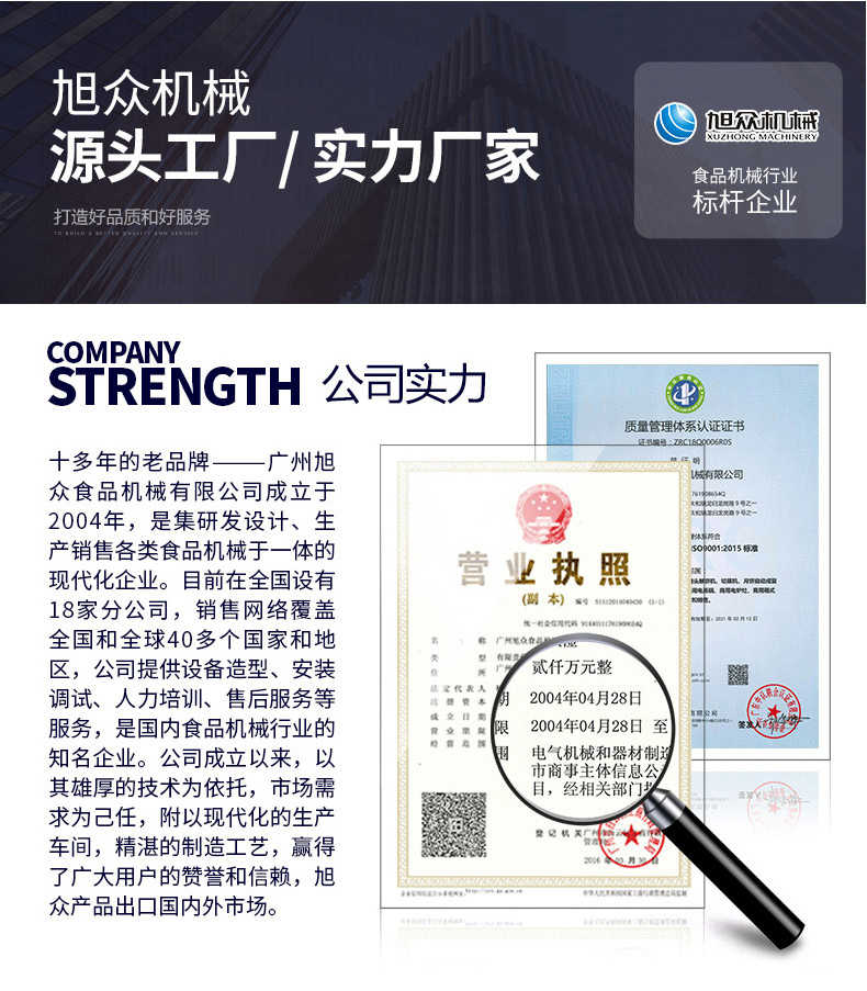 廣州旭眾食品機械有限公司是一家集科研開發,生產設計,營銷服務為一體的現代化生產企業?,F代化生產車間,精湛制造技術,所產機械歷經市場重重考驗,不斷贏得海內外客戶的贊譽。