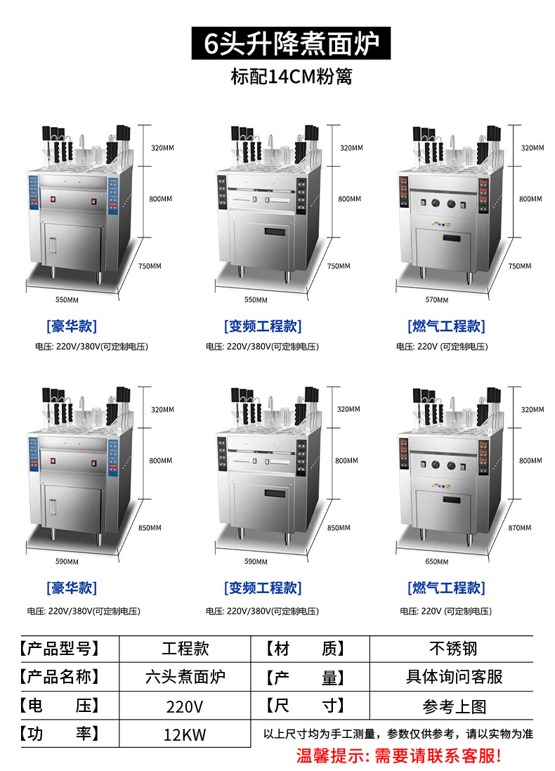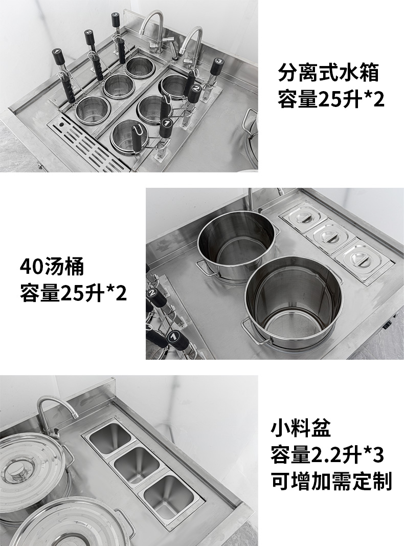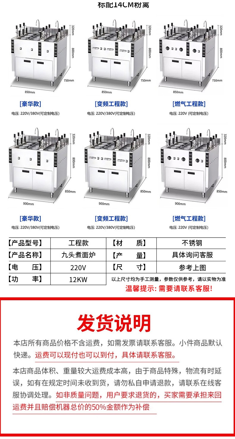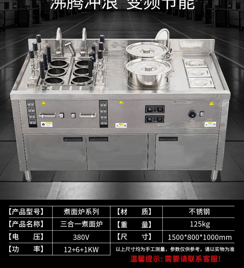 名稱三合一煮面爐 電源380V 功率12+6+1KW 產量請咨詢銷售員 尺寸1500*800*1000mm 重量125kg 規格請咨詢銷售員 其他不銹鋼材質