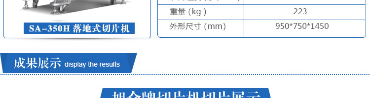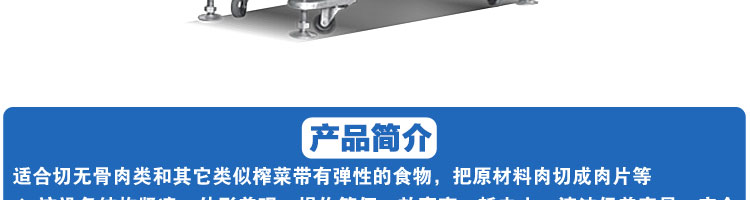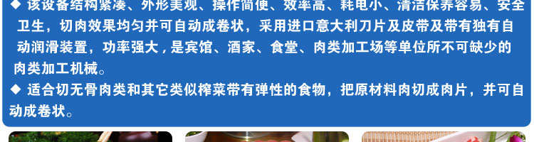 SA-350H 全自動(dòng)落地式切片機(jī),適合切無(wú)骨肉類和其他類似榨菜帶有彈性的食物,把原材料肉切成肉片,并可自動(dòng)成卷狀。可切牛肉片、羊肉片等