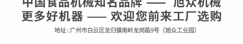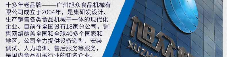 廣州旭眾食品機械有限公司是一家集科研開發,生產設計,營銷服務為一體的現代化生產企業?,F代化生產車間,精湛制造技術,所產機械歷經市場重重考驗,不斷贏得海內外客戶的贊譽。