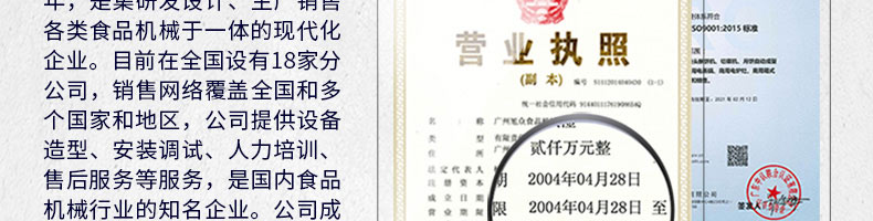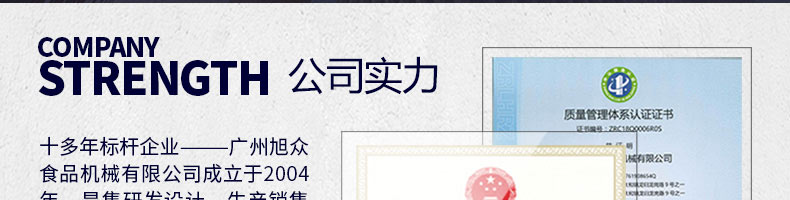 廣州旭眾食品機械有限公司是一家集科研開發,生產設計,營銷服務為一體的現代化生產企業。現代化生產車間,精湛制造技術,所產機械歷經市場重重考驗,不斷贏得海內外客戶的贊譽。